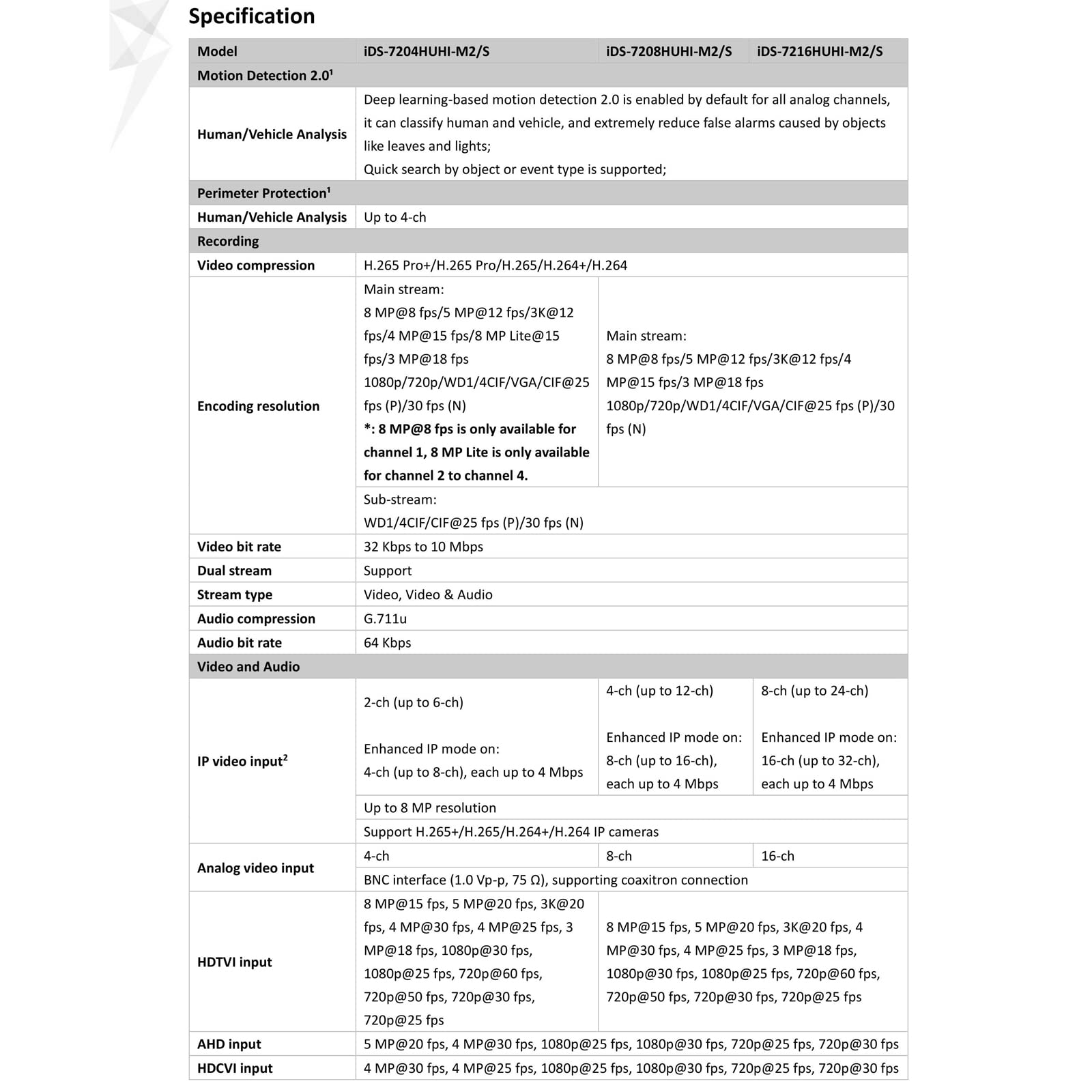 16-ch Motion Detection 2.0 or 4-ch false alarm filter, 16 Turbo HD/CVI / AHD / CVBS self-adaptive interfaces input, 2 SATA interfaces, H.265/H.265+ compression, 8MP: 8fps, 5MP: 12fps, 4MP: 15fps, 3MP: 18fps, 1920Ã1080P: 25(P)/30(N) fps/ch, 4K UHD output, support CVBS output, 380 1U case