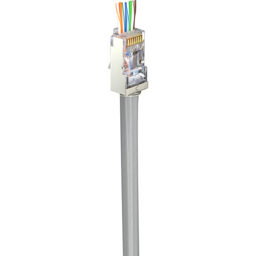 Designed to work with shielded twisted pair (STP) LAN cables, the Simply45 Cat 5e STP Shielded RJ45 Pass-Through Modular Plug connects onto 24 AWG solid and 28-26 AWG stranded LAN cables up to 0.04" in diameter. Fifty single piece pass-through modular RJ45 plugs come packed inside of a convenient plastic jar, which work with most shielded Cat 5e cables in a straight-line arrangement. Each plug features a 3-prong pin design with 50 24kt gold plating to help deliver high electrical conductivity and a stronger connection to wire conductors and has a light blue tint for easy identification. These modular plugs are rated to work with PoE and PoH devices.